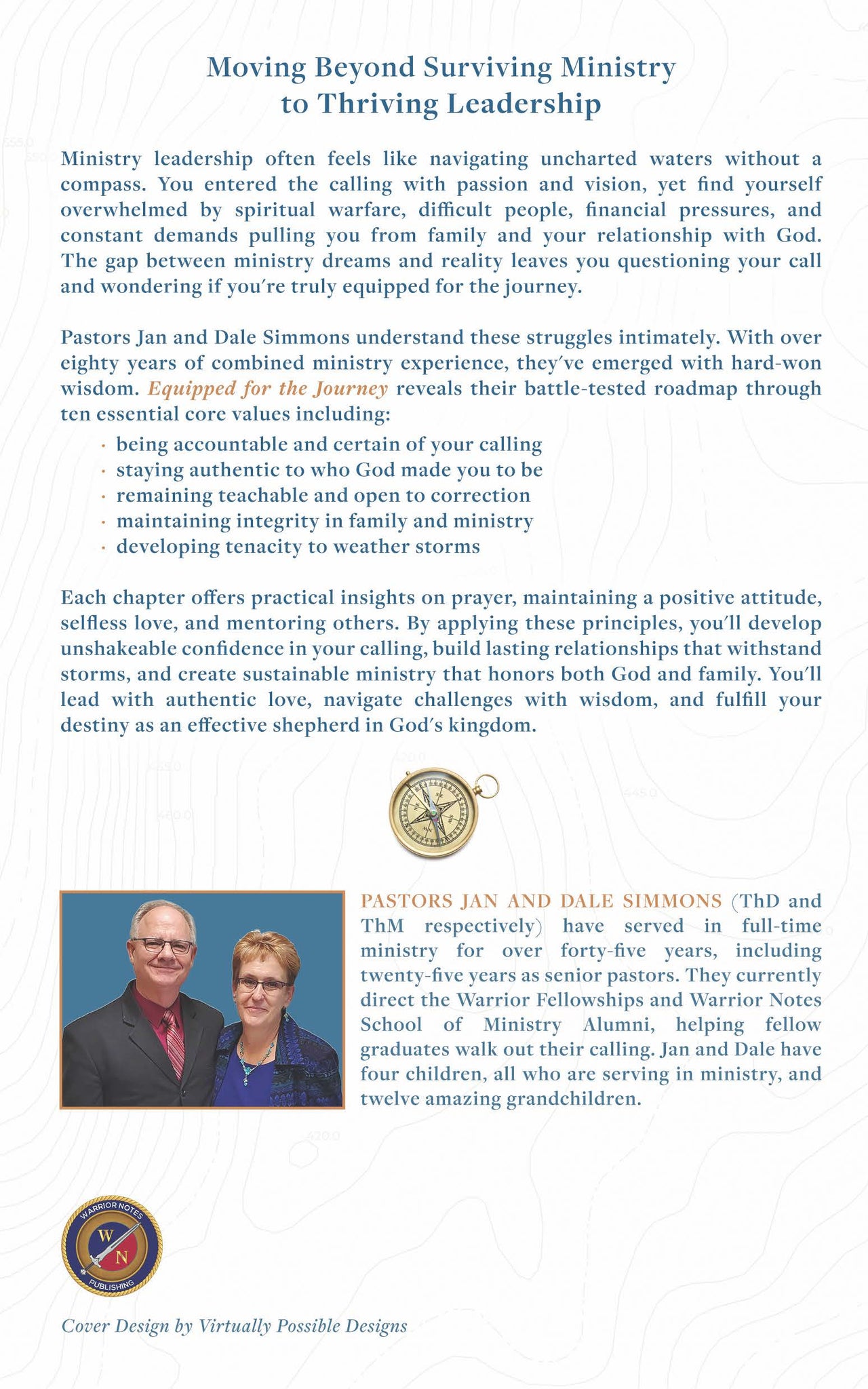 Pastors Jan and Dale Simmons understand these struggles intimately. With over eighty years of combined ministry experience, they've emerged with hard-won wisdom. Equipped for the Journey reveals their battle-tested roadmap through ten essential core values including: