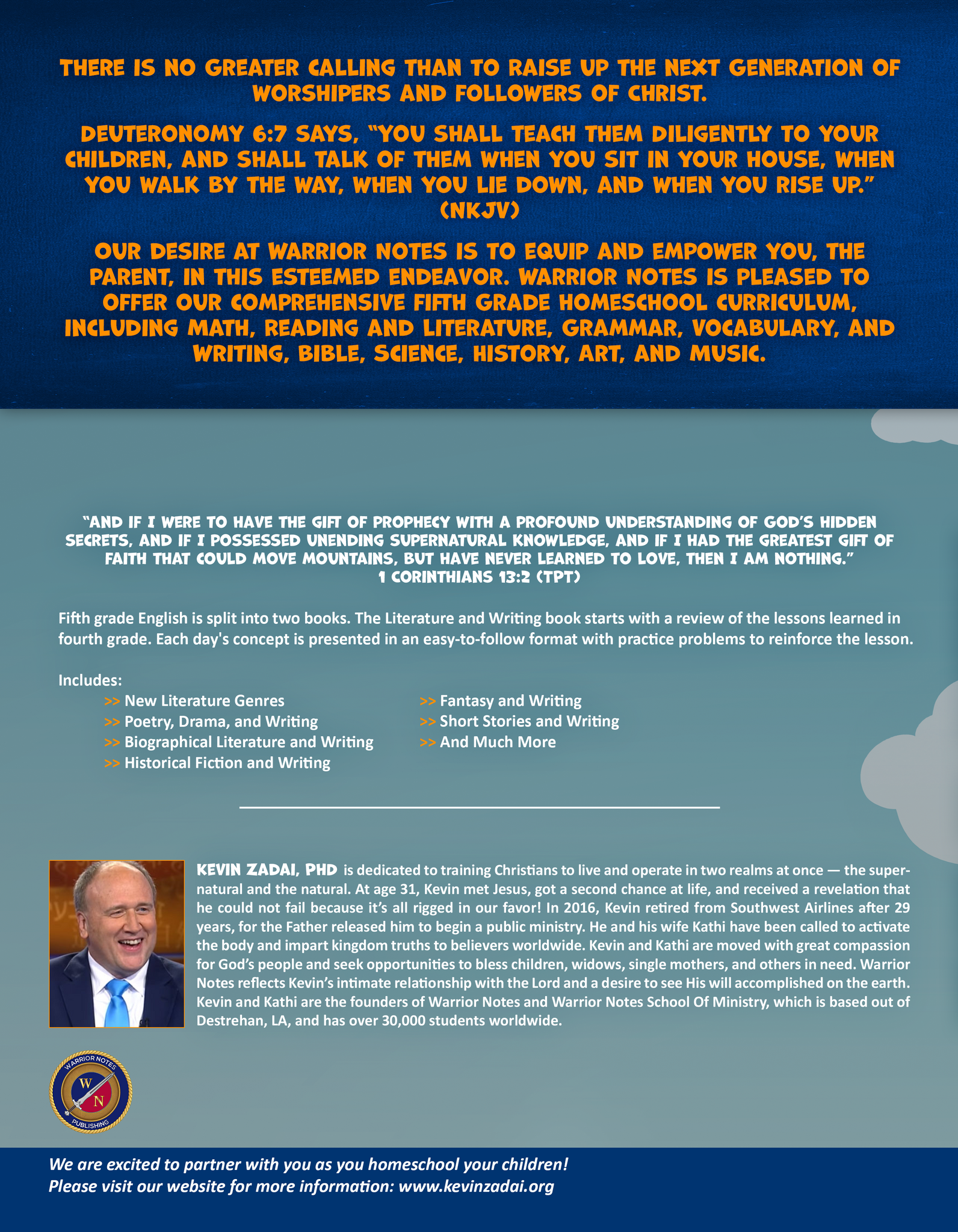 Our desire at Warrior Notes is to equip and empower you, the parent, in this esteemed endeavor. Therefore, Warrior Notes is pleased to offer our comprehensive 5th grade homeschool curriculum, including Bible, Math, English, Science, History, Art, and Music.