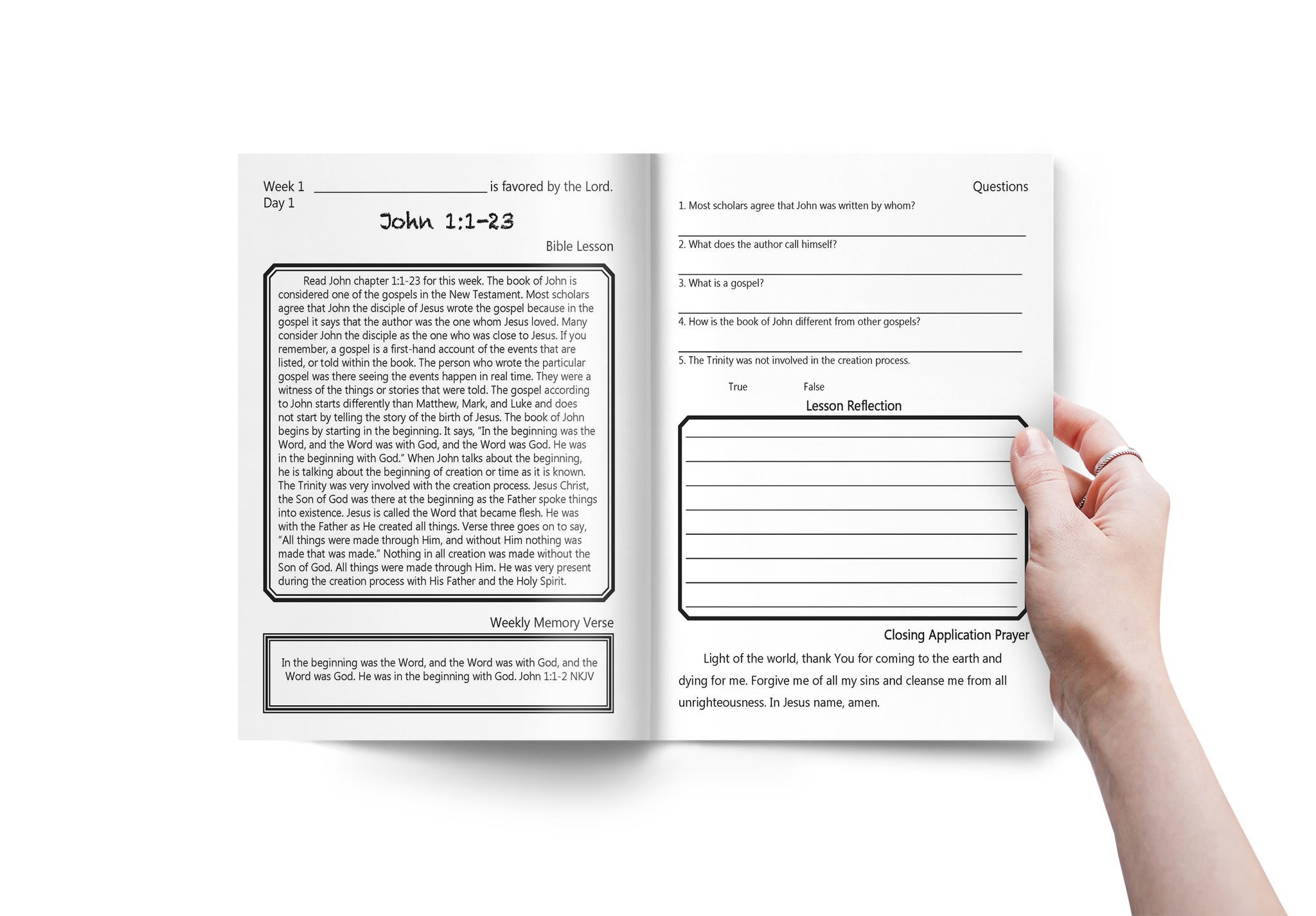 5th grade Bible is split into two books. Bible book 1 starts with John chapter 1:1 and ends with John chapter 10:12 Each day's concept is presented in an easy-to-follow format with each lesson having an opening prayer, the Bible lesson and questions to answer from the lesson, the Bible memory verse, daily reflection, and a closing prayer.