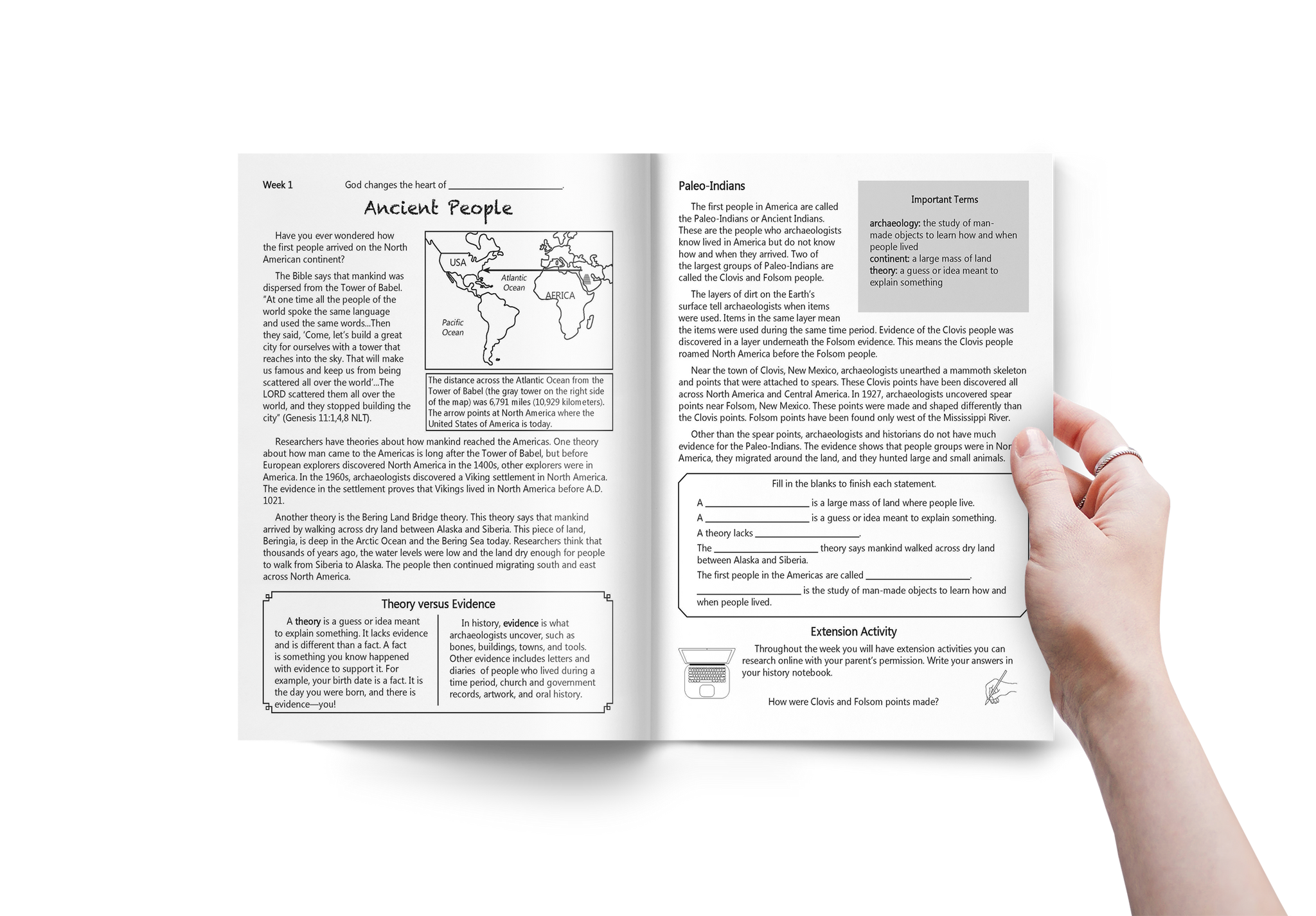 5th grade History is split into two books covering American History from ancient times after Creation up to the post-Civil War era. Each unit is introduced with helpful tips for the parent on how to enhance learning. Vocabulary words are included to guide the student’s learning and growth as they explore the story of America’s past. Each day's lesson is presented as a narrative, an answer to a topical question, or a record of God’s interaction with people in North America. Some units have projects for assessments that allow students to creatively showcase and further their knowledge of American History. The lessons highlight the roles that Father God, Jesus, Holy Spirit, and Christian leaders had in shaping America’s culture, beliefs, history, and development as One Nation Under God.