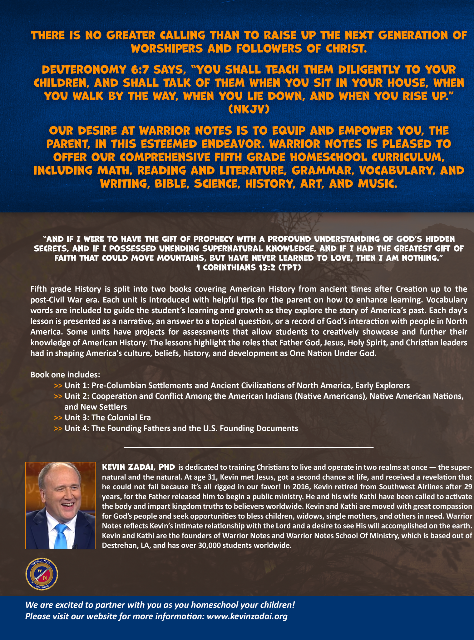 Our desire at Warrior Notes is to equip and empower you, the parent, in this esteemed endeavor. Therefore, Warrior Notes is pleased to offer our comprehensive 5th grade homeschool curriculum, including Bible, Math, English, Science, History, Art, and Music.