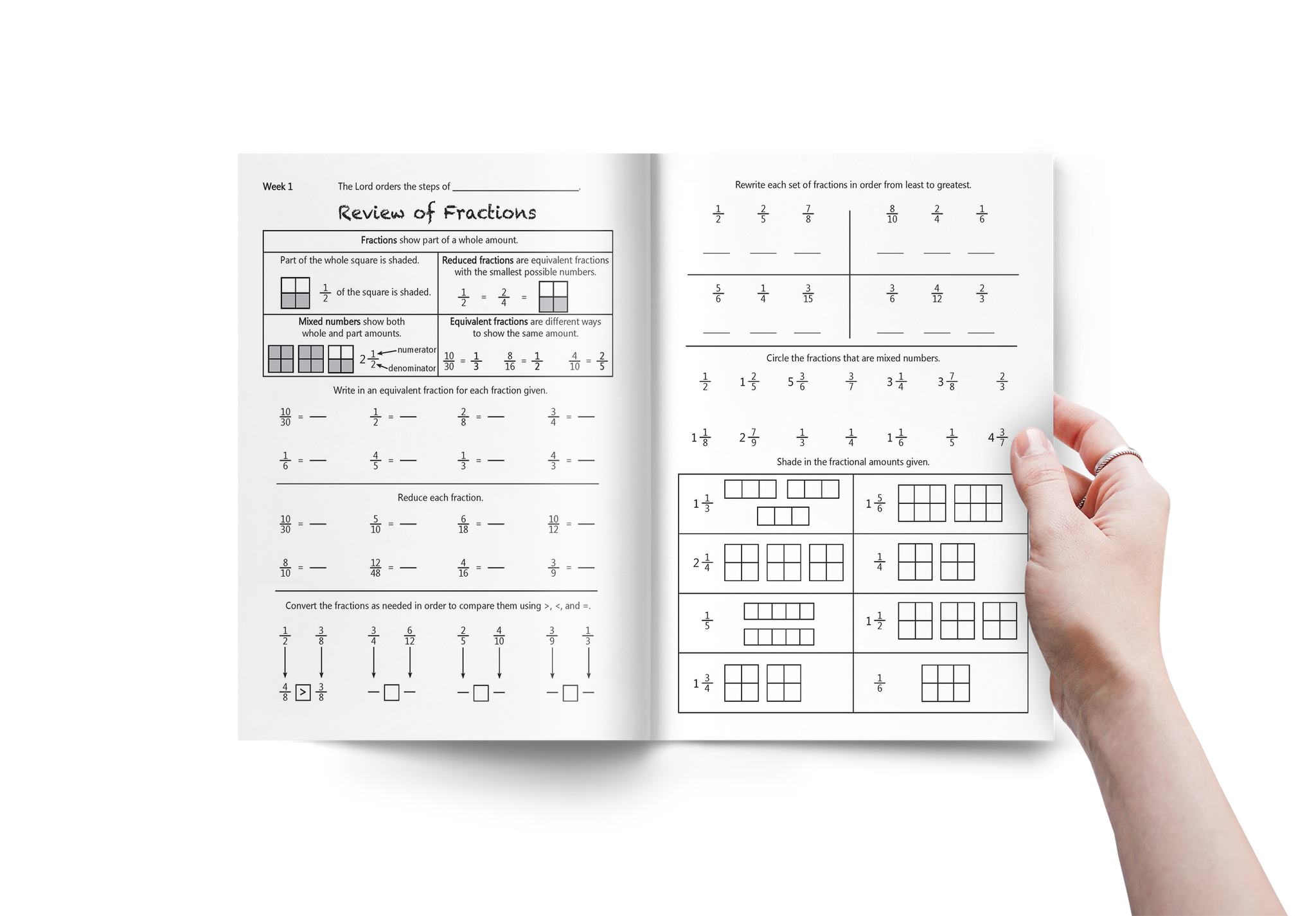 5th grade Math is split into two books. Math book 1 starts with a review of the lessons learned in 4th grade Math. Each day's concept is presented in an easy-to-follow format with practice problems to reinforce the lesson.