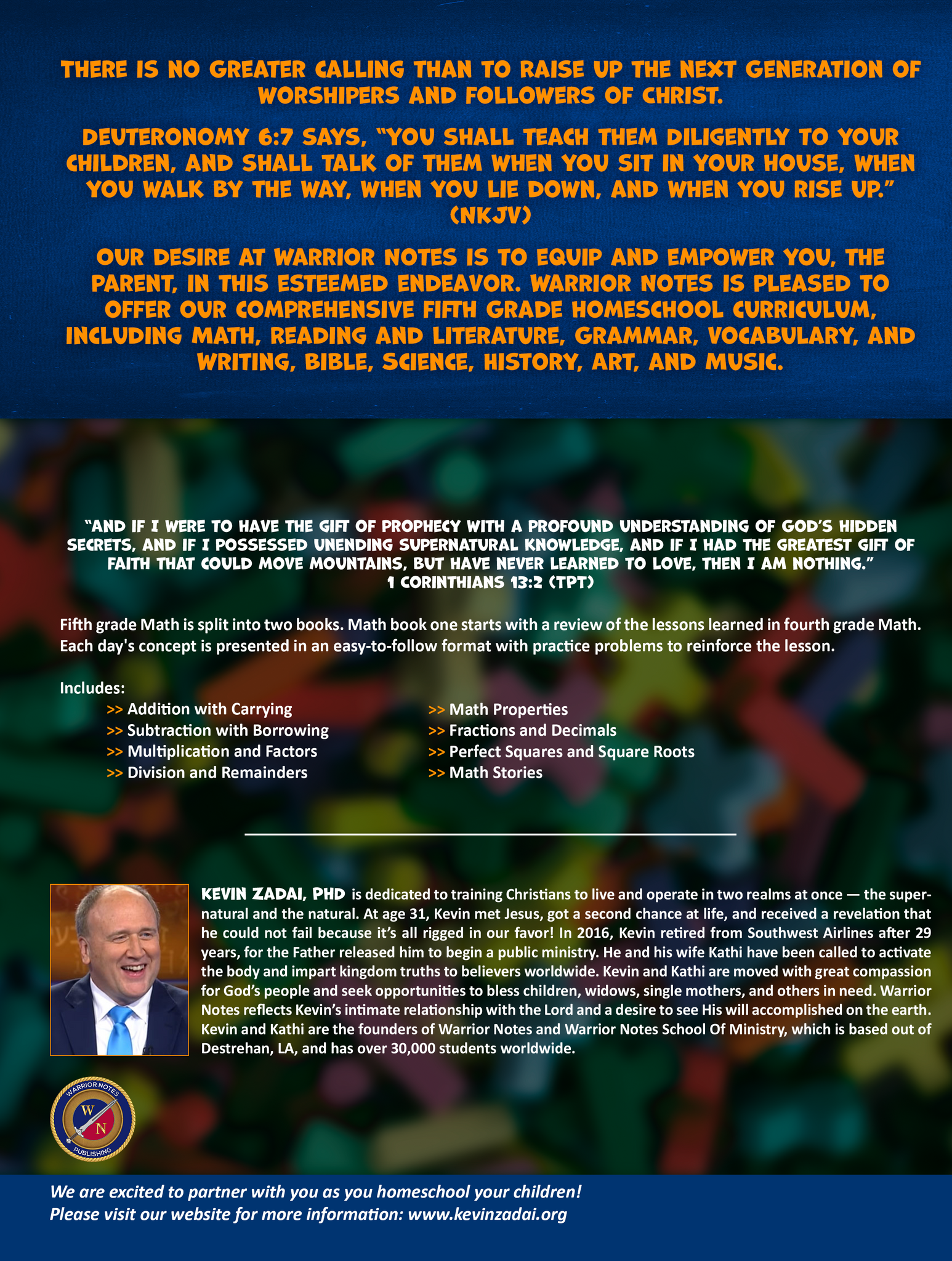 Our desire at Warrior Notes is to equip and empower you, the parent, in this esteemed endeavor. Therefore, Warrior Notes is pleased to offer our comprehensive 5th grade homeschool curriculum, including Bible, Math, English, Science, History, Art, and Music.