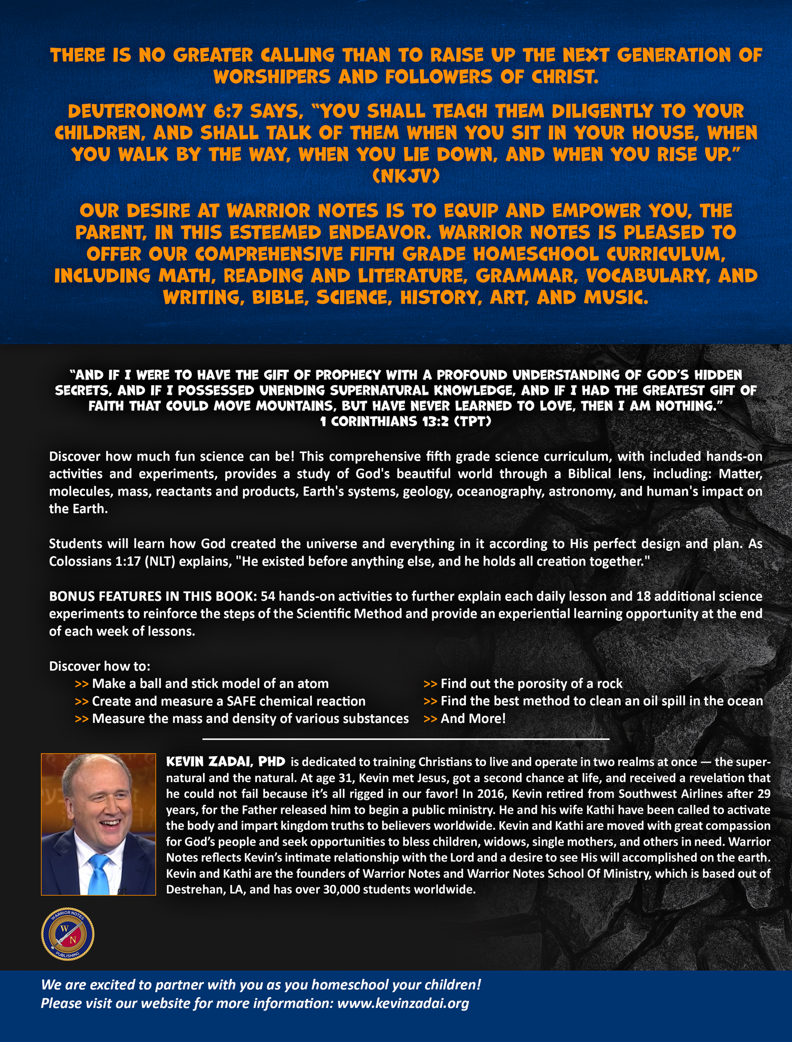 Our desire at Warrior Notes is to equip and empower you, the parent, in this esteemed endeavor. Therefore, Warrior Notes is pleased to offer our comprehensive 5th grade homeschool curriculum, including Bible, Math, English, Science, History, Art, and Music.