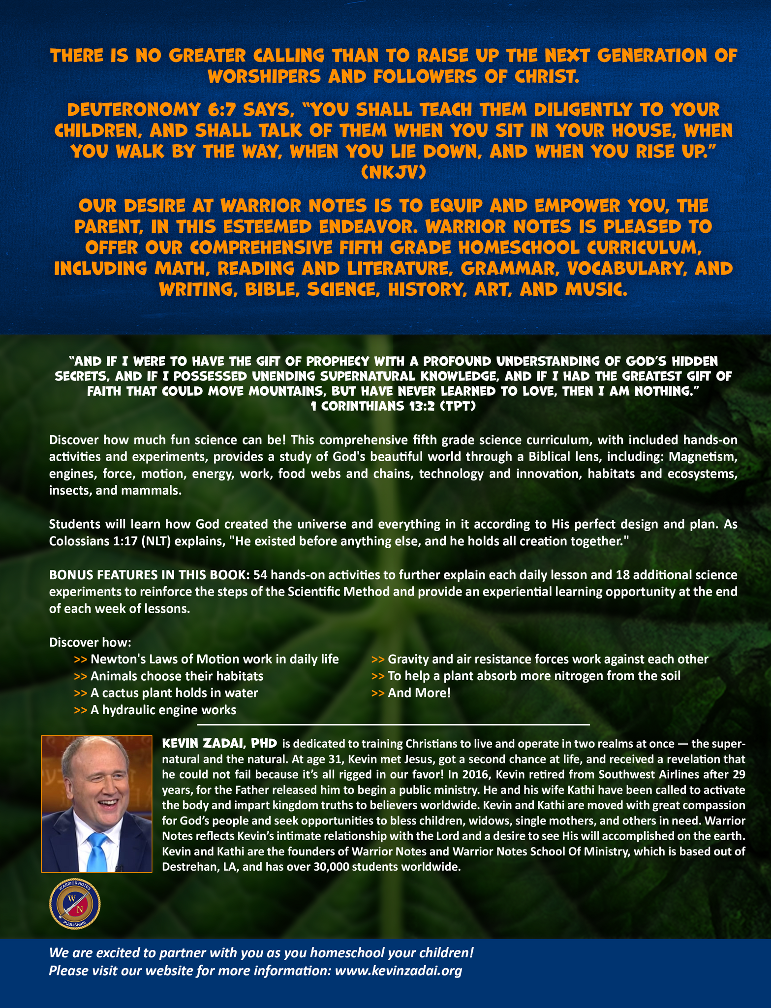 Our desire at Warrior Notes is to equip and empower you, the parent, in this esteemed endeavor. Therefore, Warrior Notes is pleased to offer our comprehensive 5th grade homeschool curriculum, including Bible, Math, English, Science, History, Art, and Music.