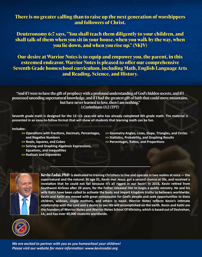 Our desire at Warrior Notes is to equip and empower you, the parent, in this esteemed endeavor. Warrior Notes is pleased to offer our comprehensive Seventh Grade homeschool curriculum, including Math, English Language Arts and Reading, Science, and History.