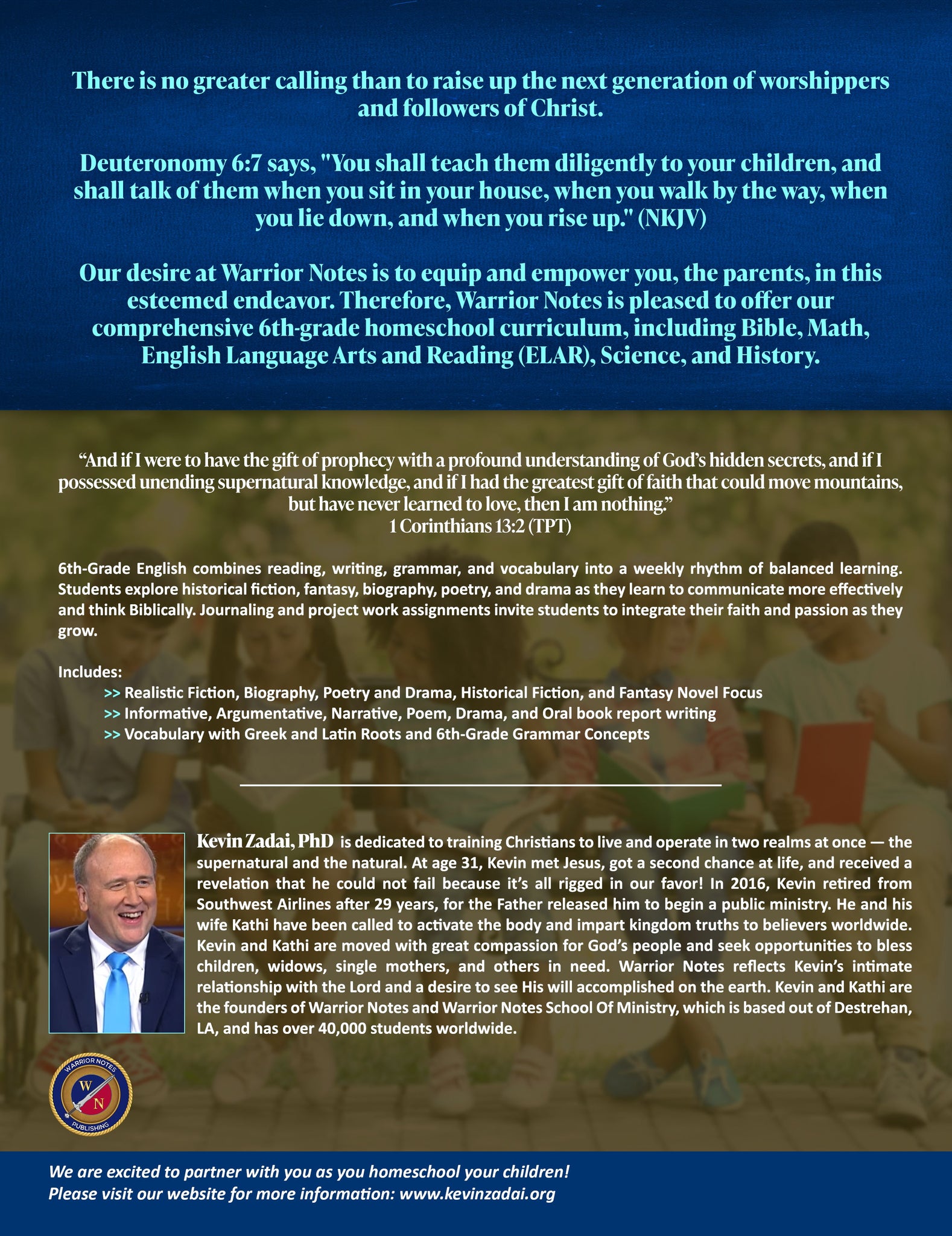 Our desire at Warrior Notes is to equip and empower you, the parent, in this esteemed endeavor. Therefore, Warrior Notes is pleased to offer our comprehensive 6th-grade homeschool curriculum, including Bible, Math, English Language Arts and Reading (ELAR), Science, and History.