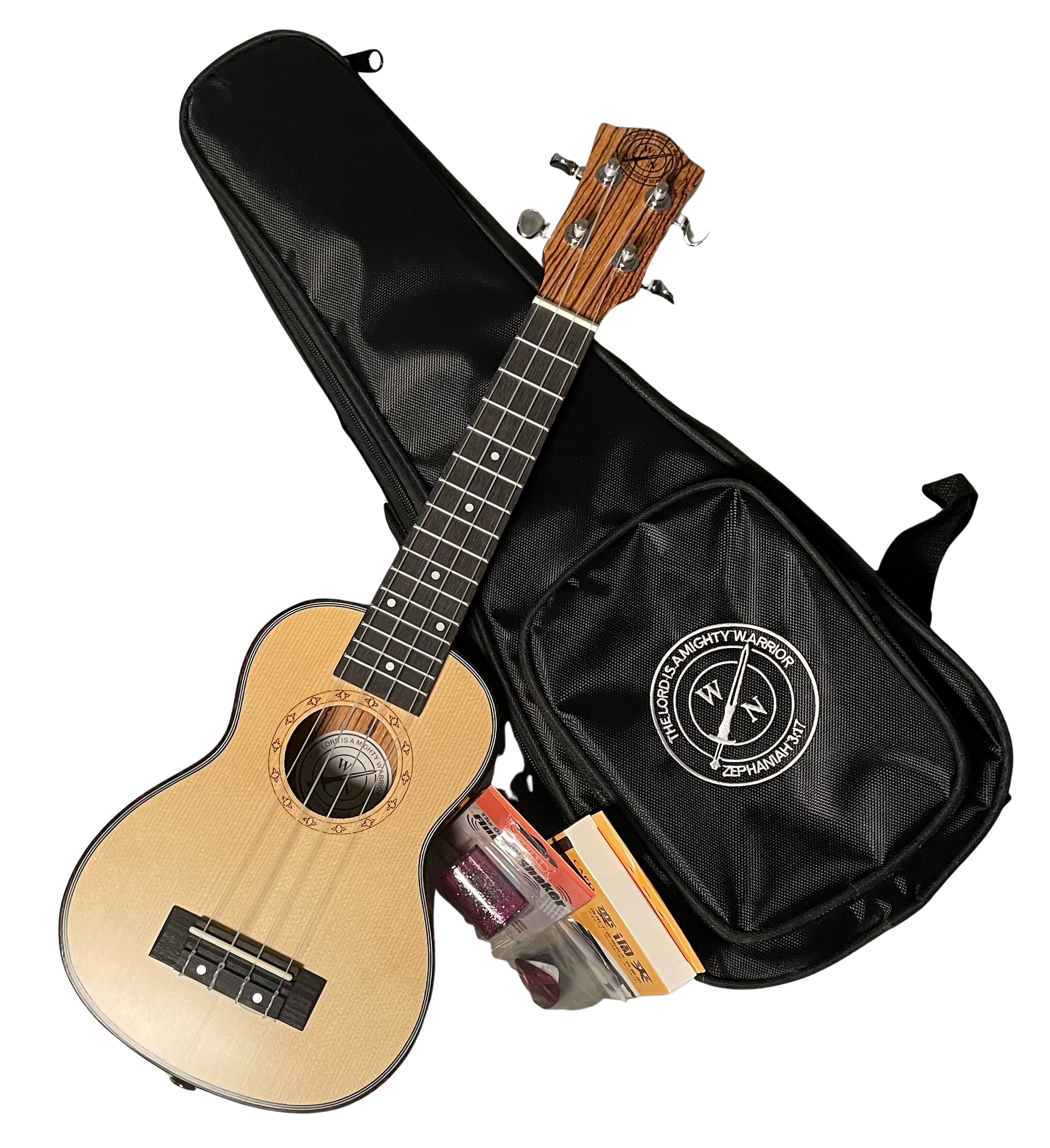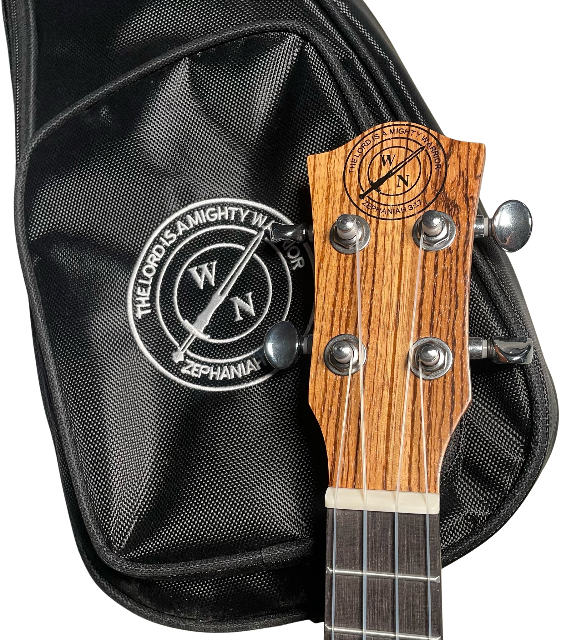 This ukulele also has the Warrior Notes Logo embossed on the instrument and comes with a soft case with a Warrior Notes logo.